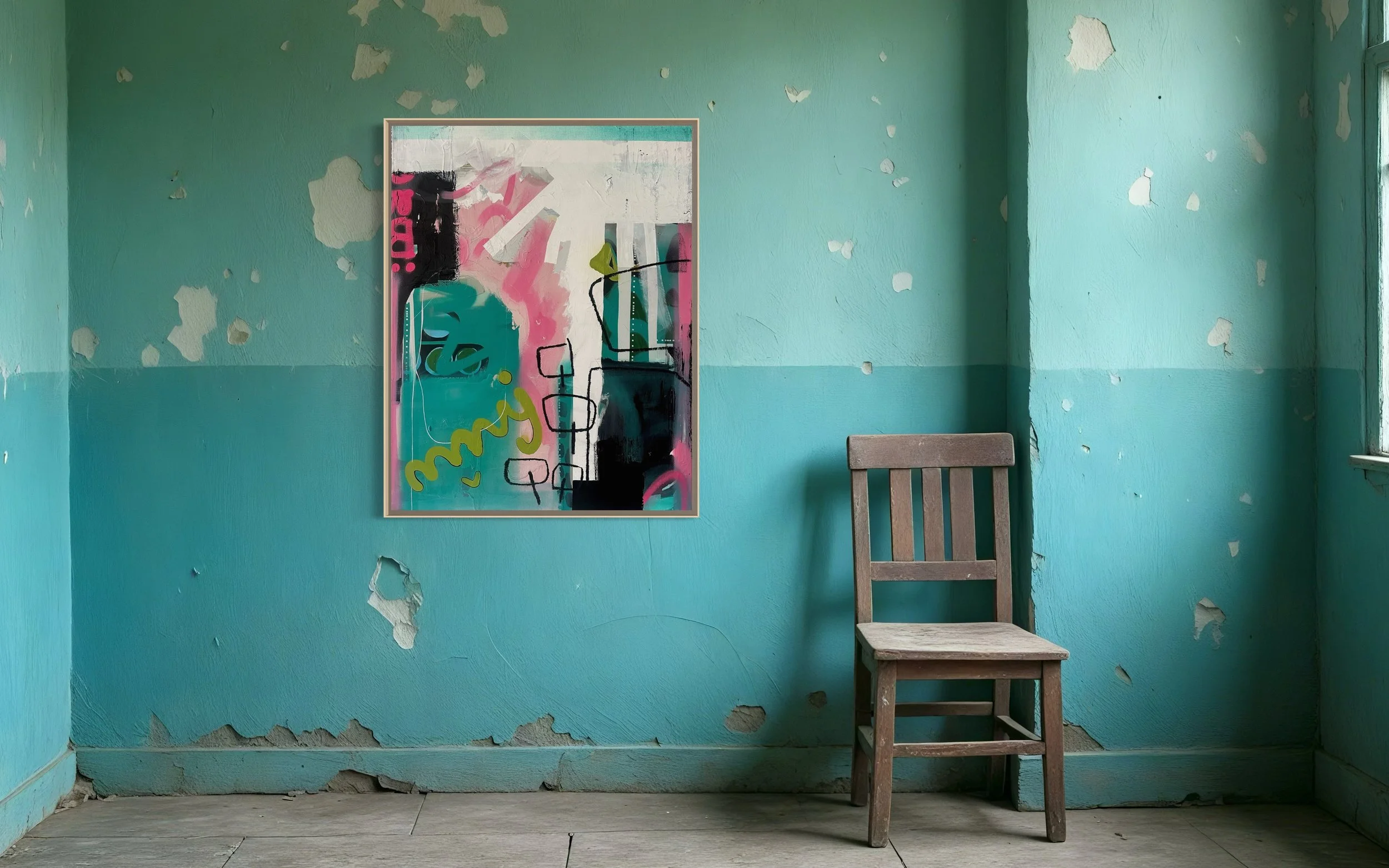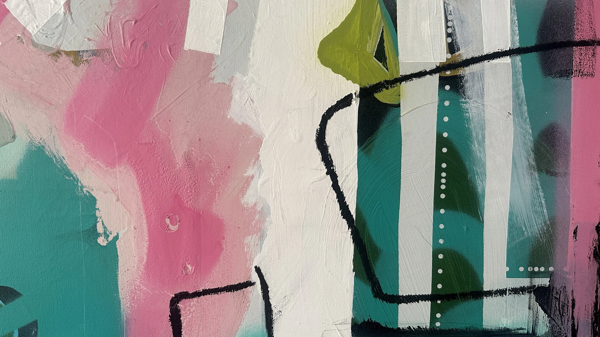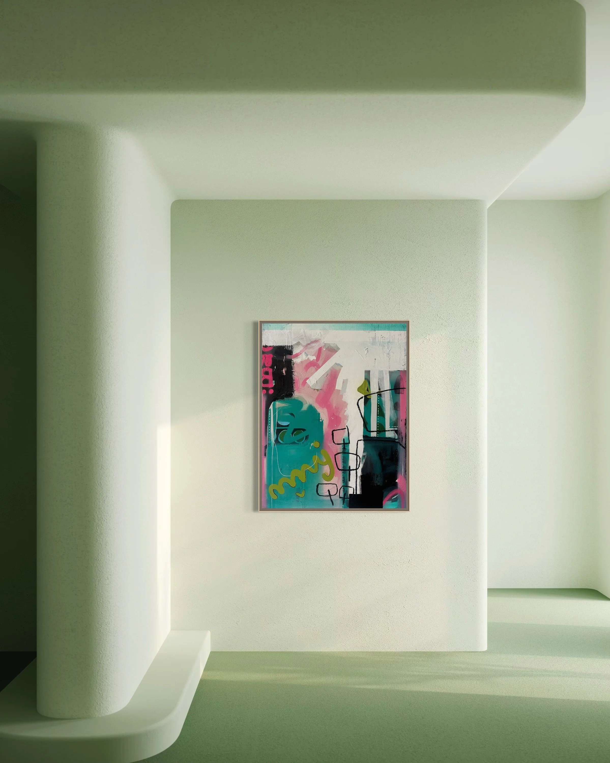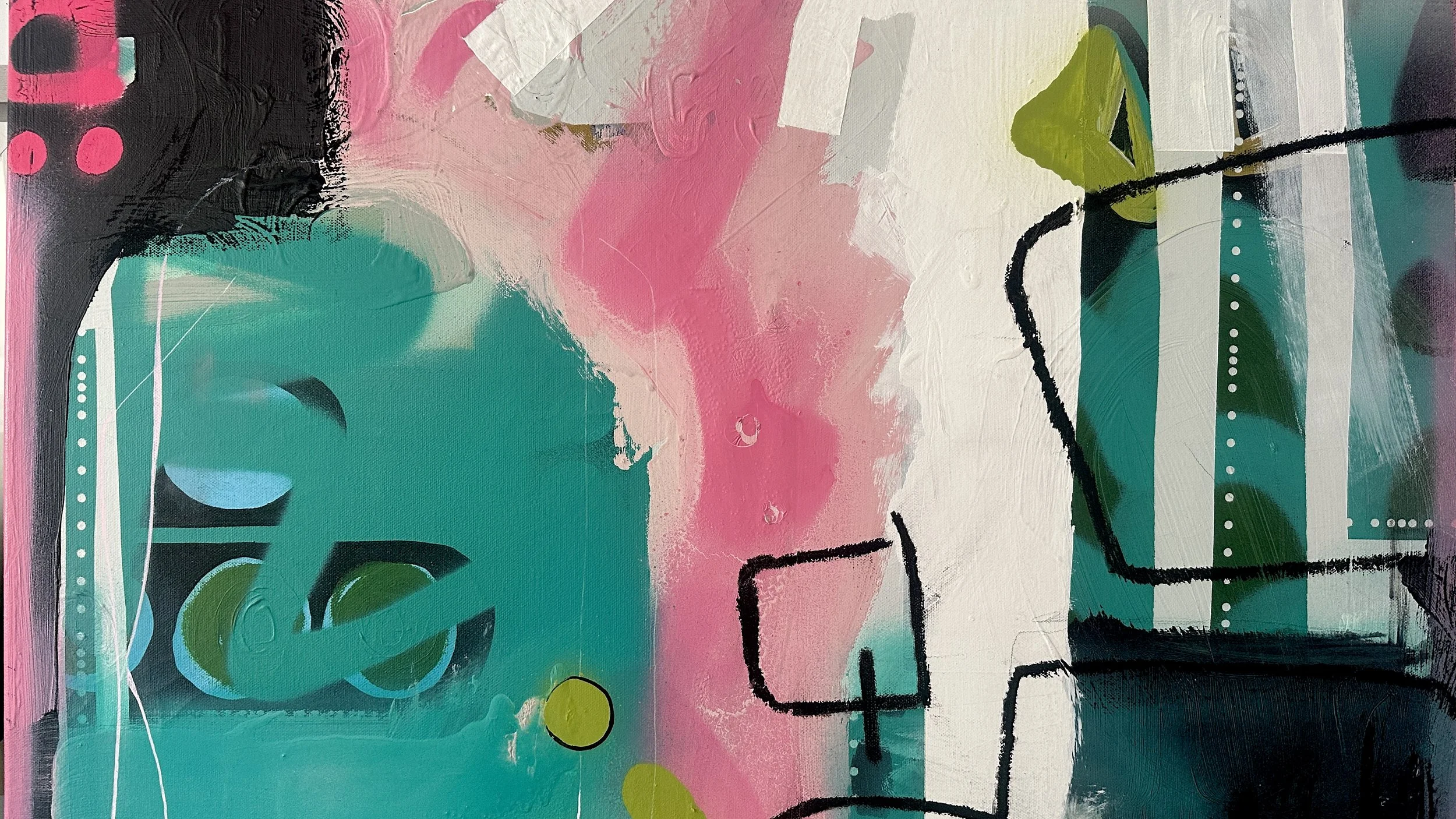 “This piece invites the viewer into a dialogue between colour, gesture, and emotion. The confident layering of teal, the various pink tones, and white establishes a dynamic tension — a sense of movement that feels both intentional and instinctive. Loose, organic forms intertwine with sharper graphic elements, suggesting a search for structure within spontaneity. - EmmaAnne, Wiltshire.”