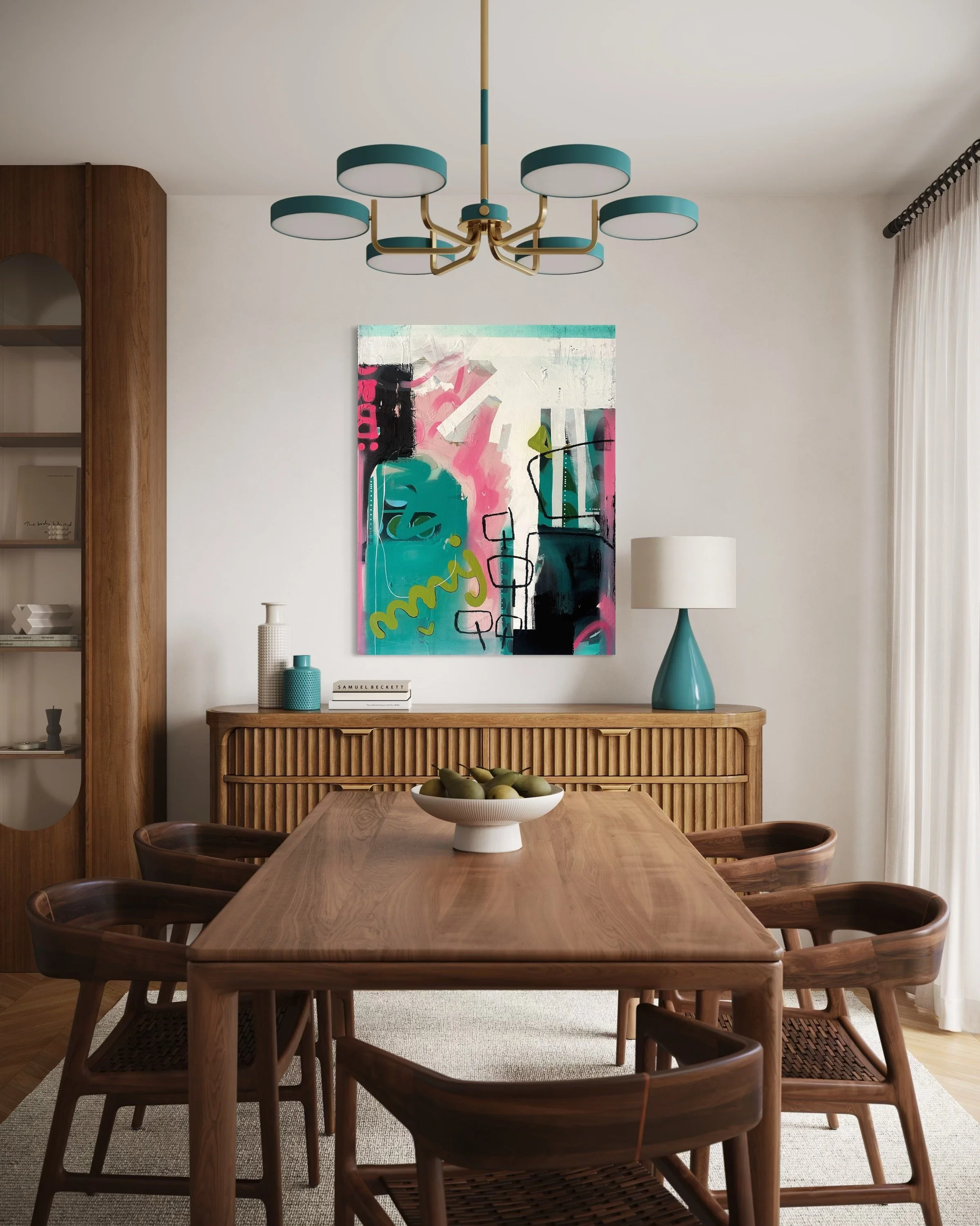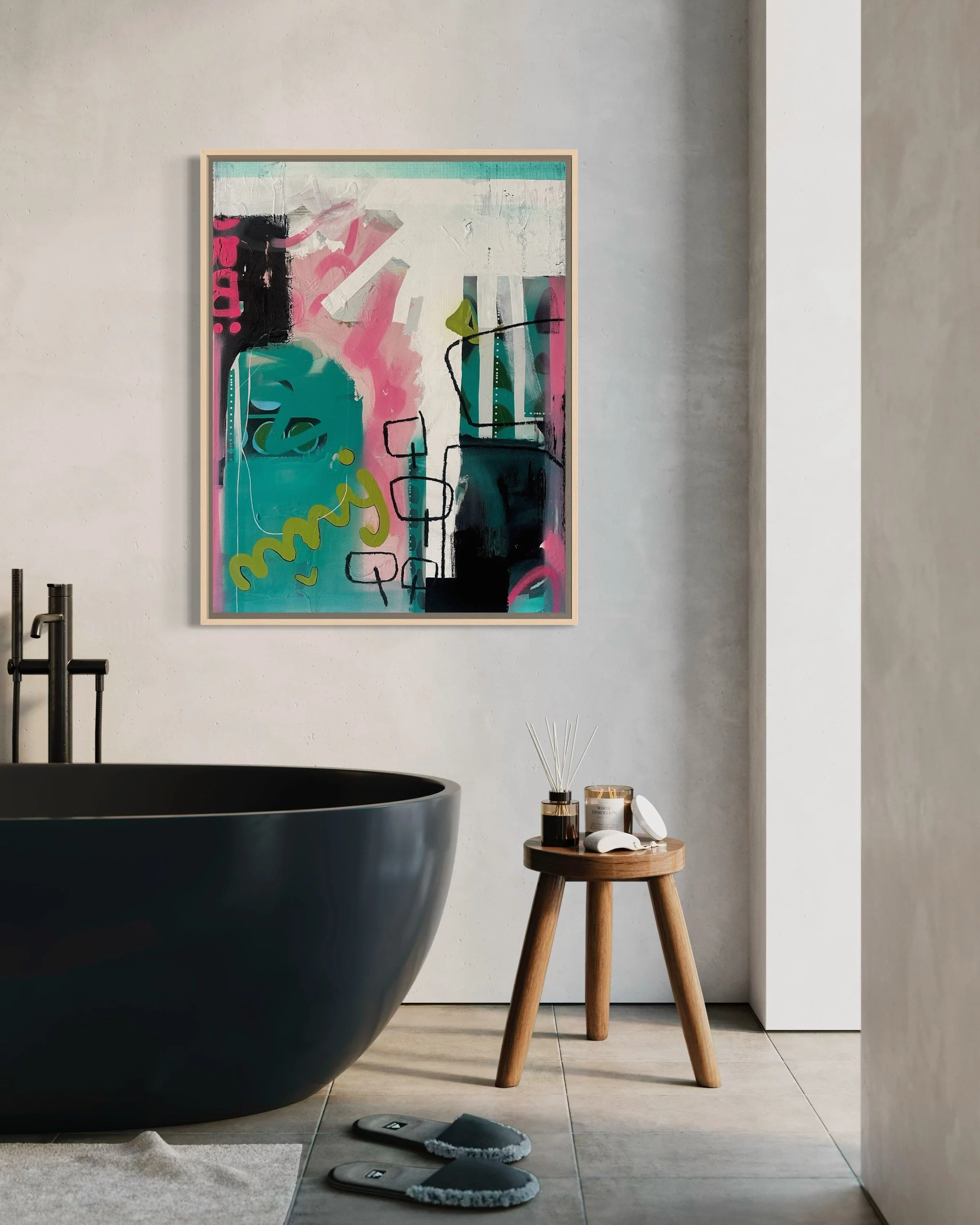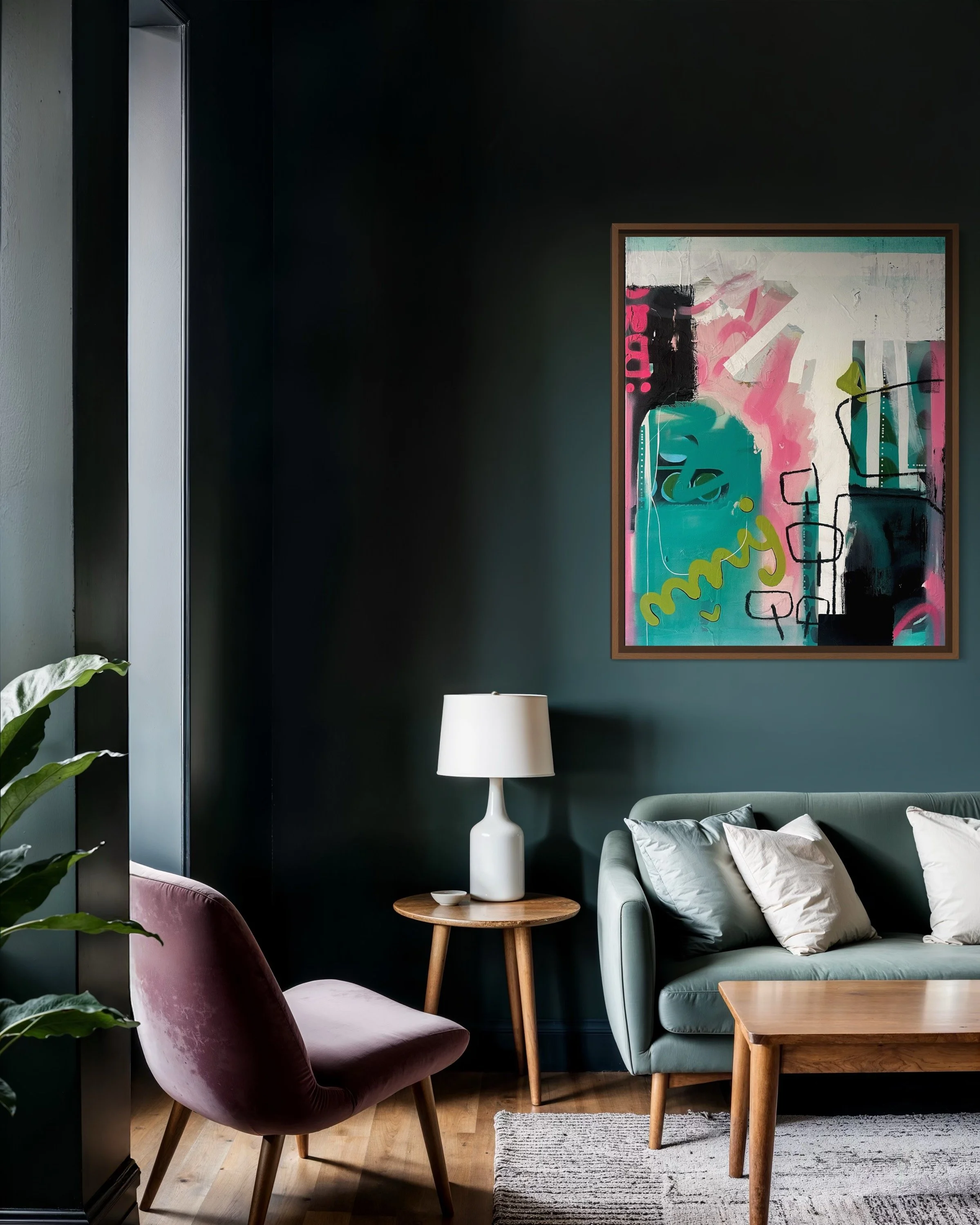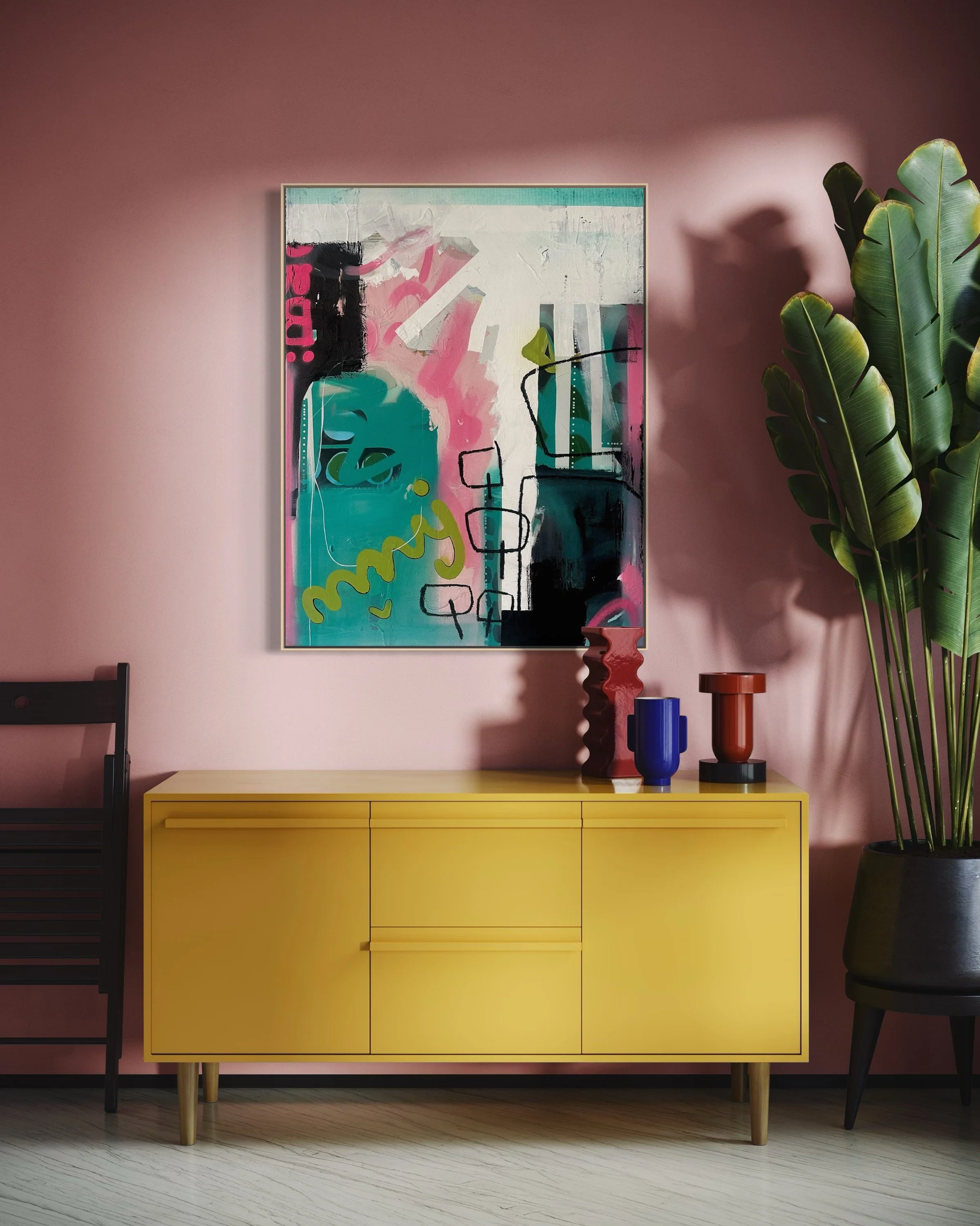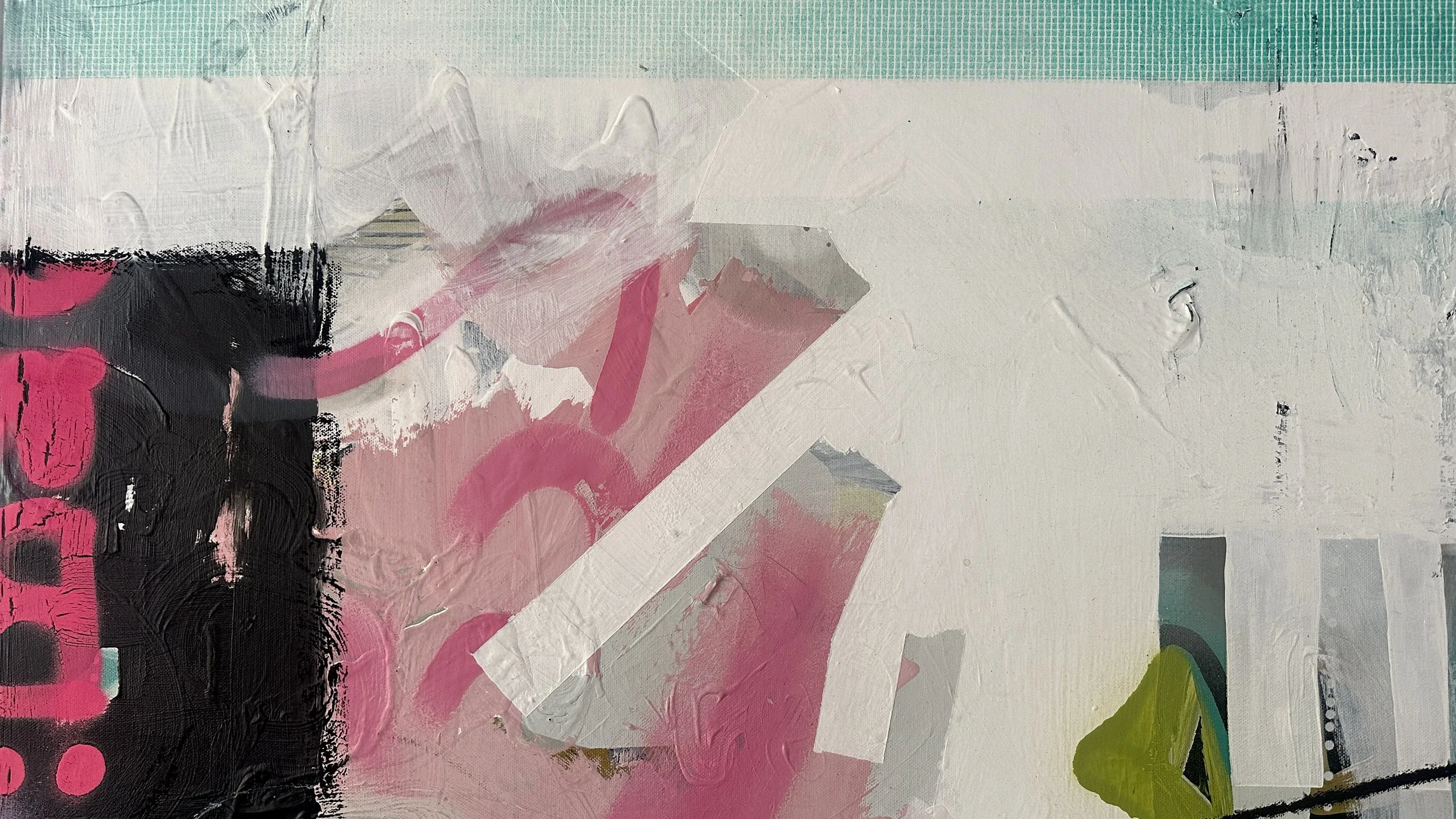 “This piece invites the viewer into a dialogue between colour, gesture, and emotion. The confident layering of teal, the various pink tones, and white establishes a dynamic tension — a sense of movement that feels both intentional and instinctive. Loose, organic forms intertwine with sharper graphic elements, suggesting a search for structure within spontaneity. - EmmaAnne, Wiltshire.”